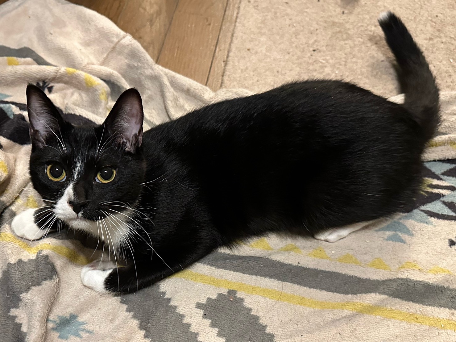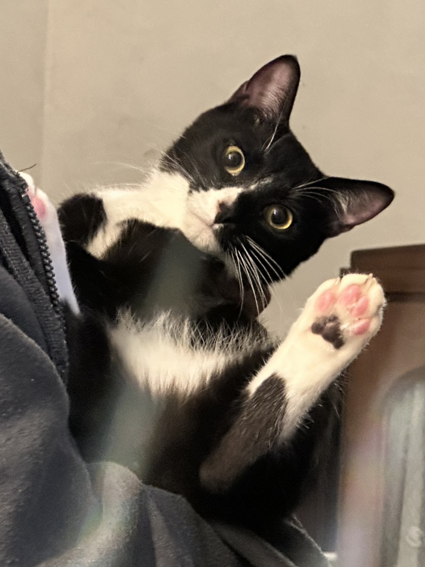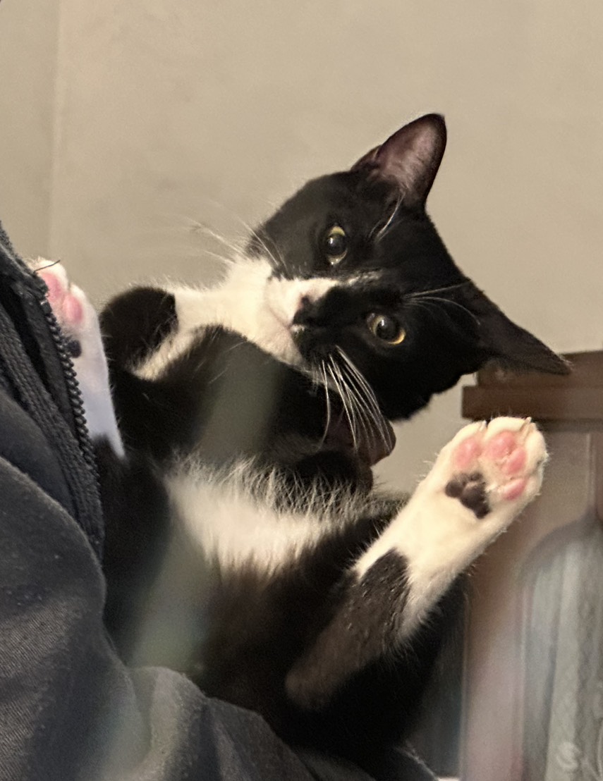 白黒タキシード柄で、先っぽだけ白いしっぽがチャームポイントの子です。