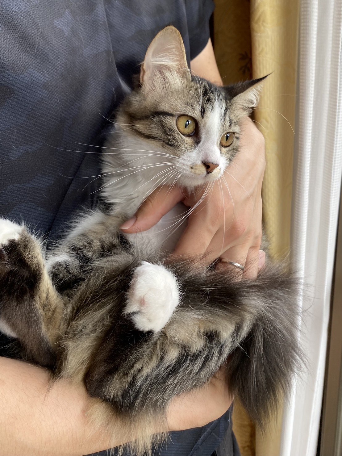 抱っこをされると固まってしまいますが、落ち着いた性格でとてもいい子です。人馴れまであと一歩です。