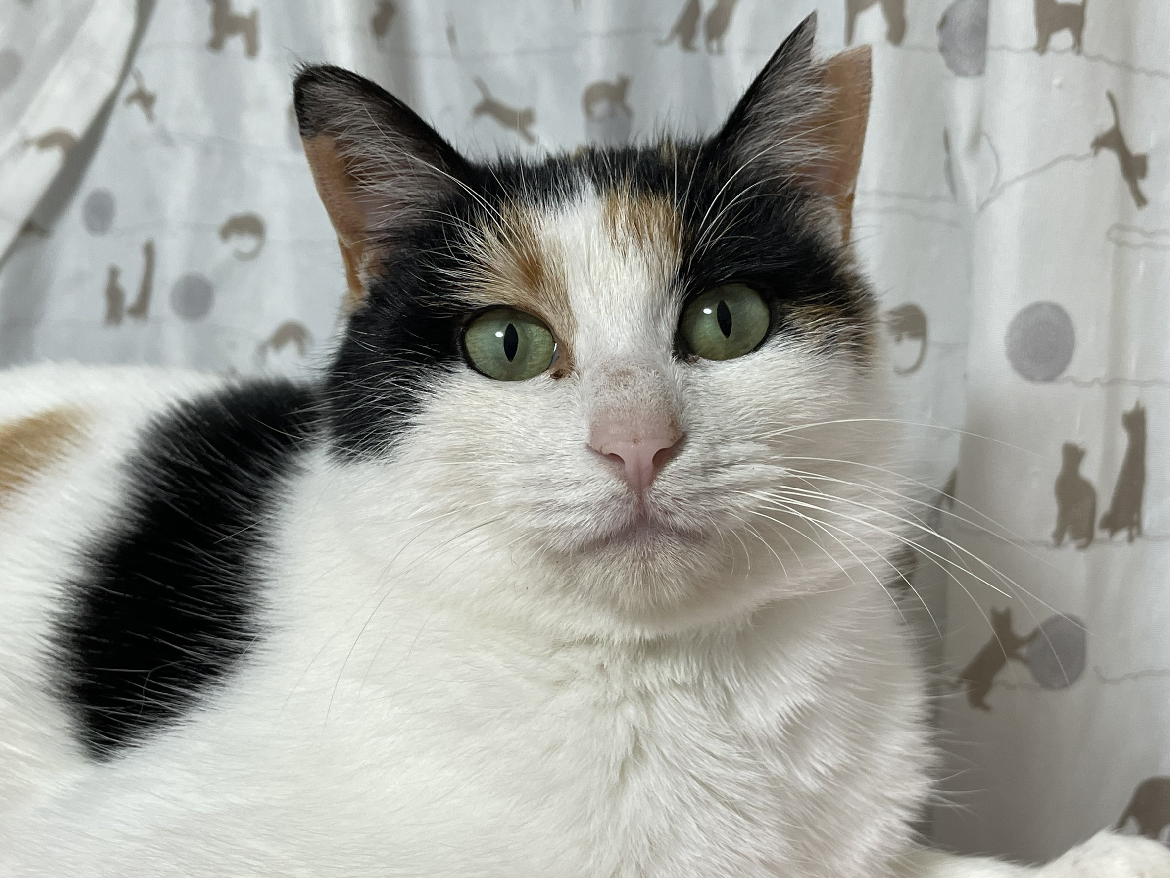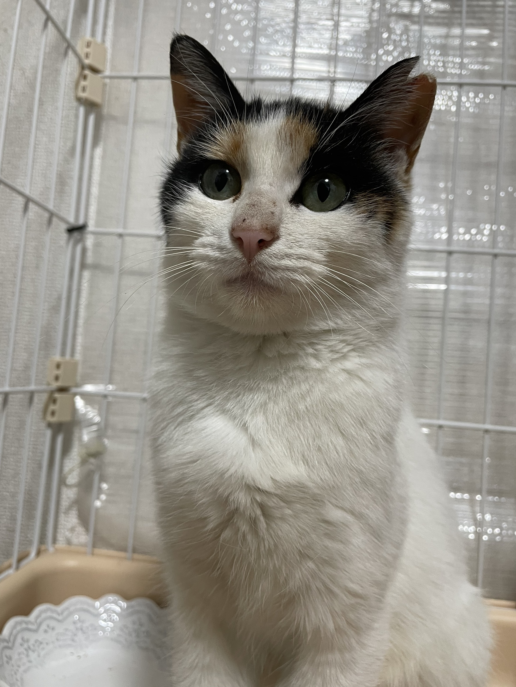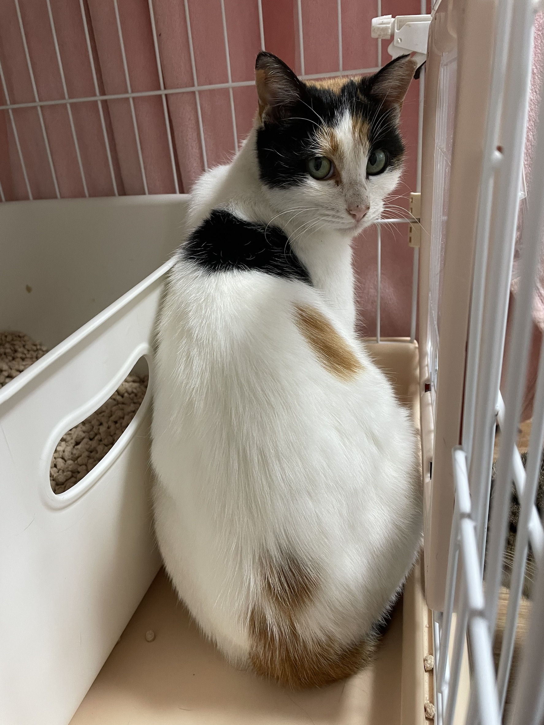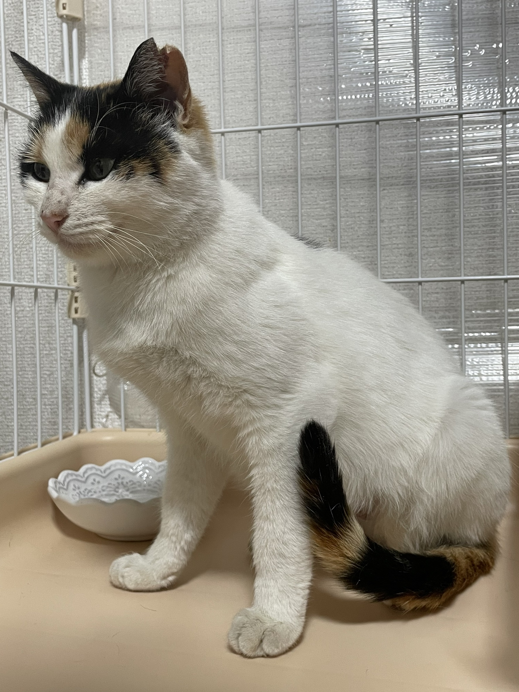 とても大人しく清楚な美人さんです♪白が多く、しっぽは三毛でとても長く美しいです♪