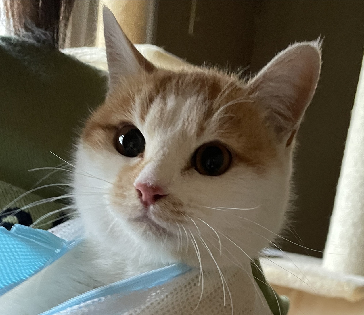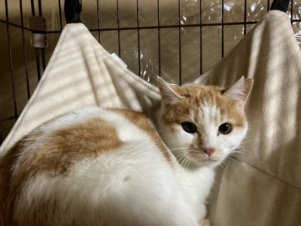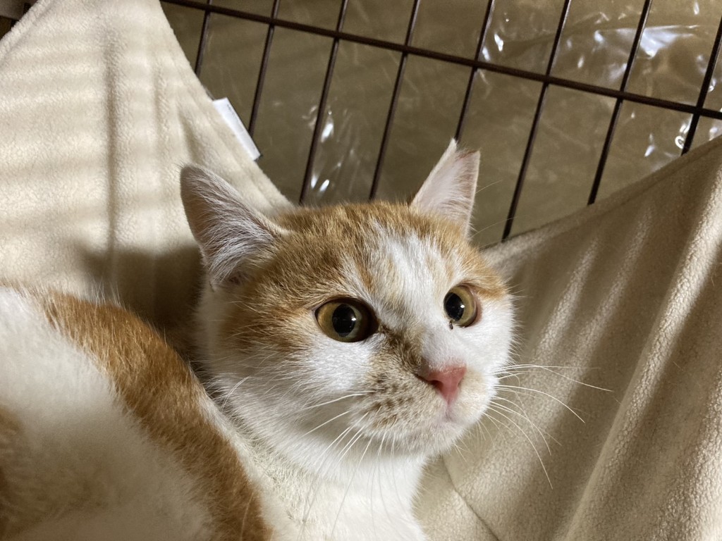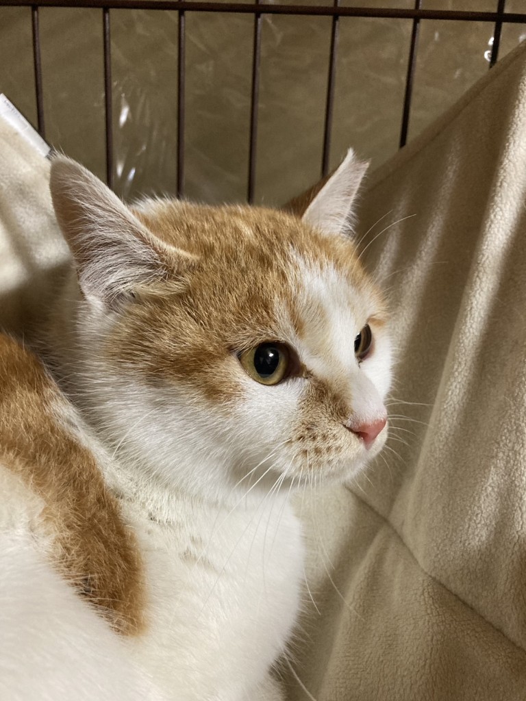 保護したばかりでまだ緊張気味ですが、なでなで出来ます♪珍しい茶白の女の子で、No.399アーニャちゃんの姉妹です。